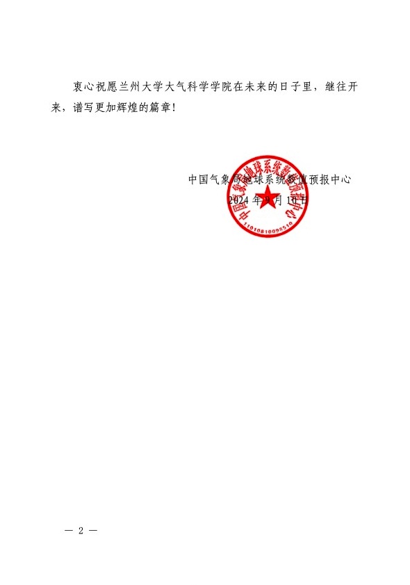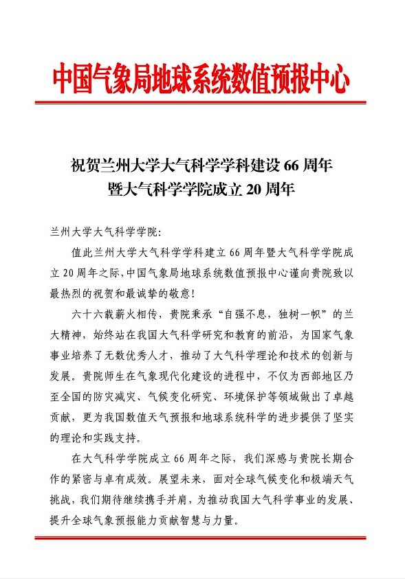 中国气象局数值预报中心致bat365官网登录在线主页建院20周年贺信