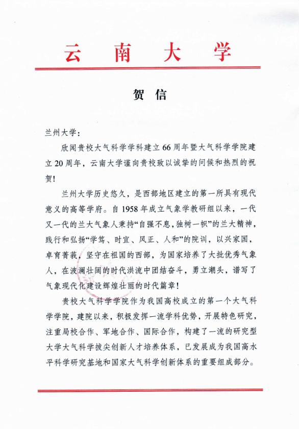 云南大学致bat365官网登录在线主页建院20周年贺信