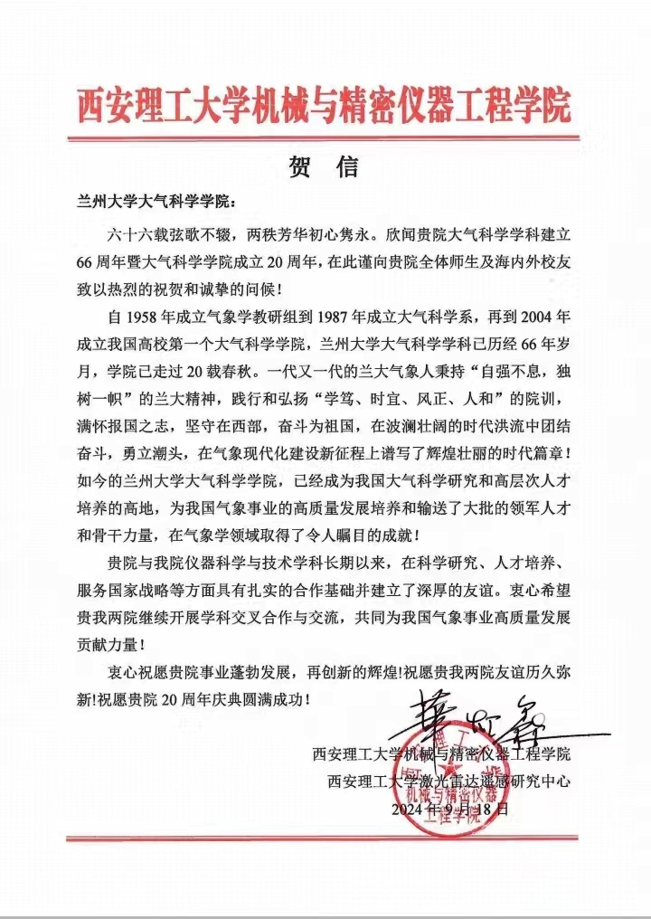 西安理工大学机械与精密仪器工程学院、西安理工大学激光雷达遥感研究中心致bat365官网登录在线主页建院20周年贺信