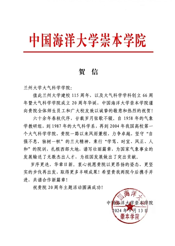 中国海洋大学崇本学院致bat365官网登录在线主页建院20周年贺信