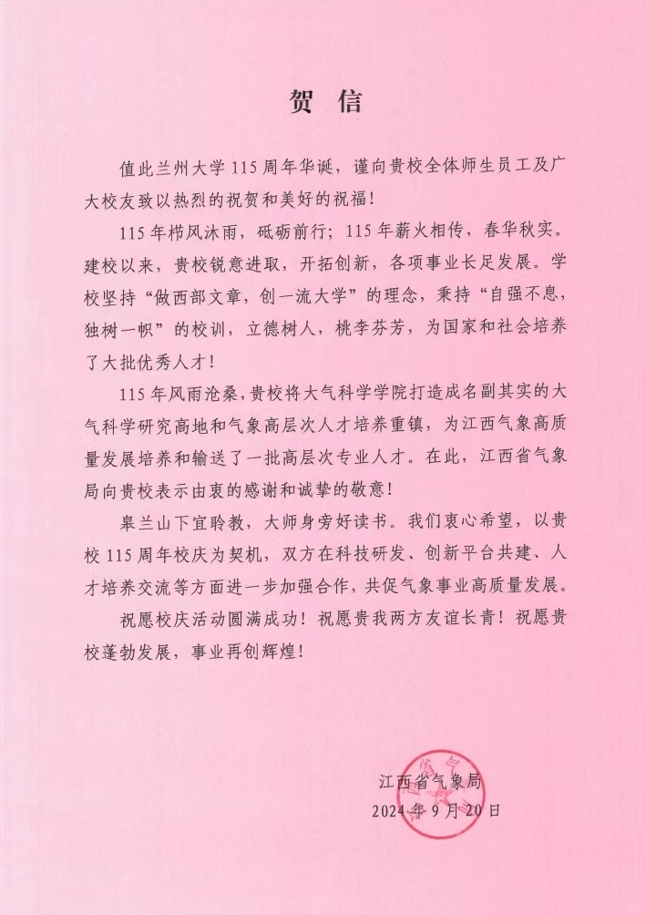 江西省气象局致bat365官网登录在线主页建院20周年贺信