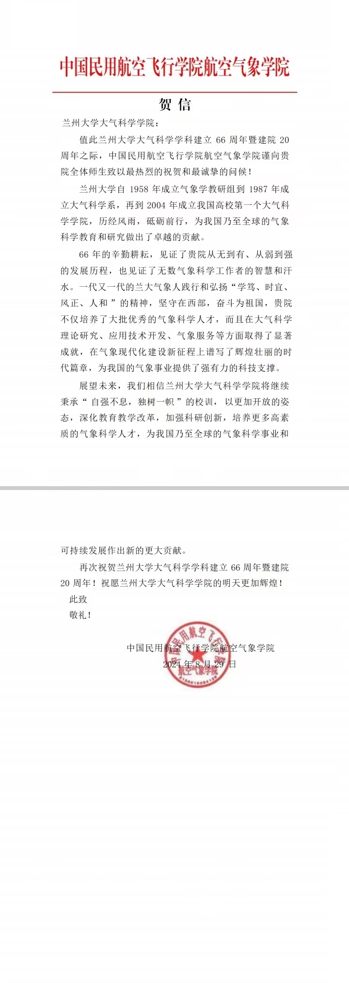 中国民用航空飞行学院航空气象学院致bat365官网登录在线主页建院20周年贺信