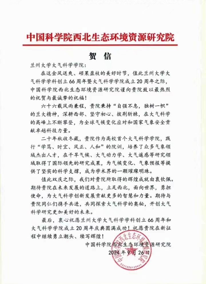 中国科学院西北生态环境资源研究院致bat365官网登录在线主页建院20周年贺信