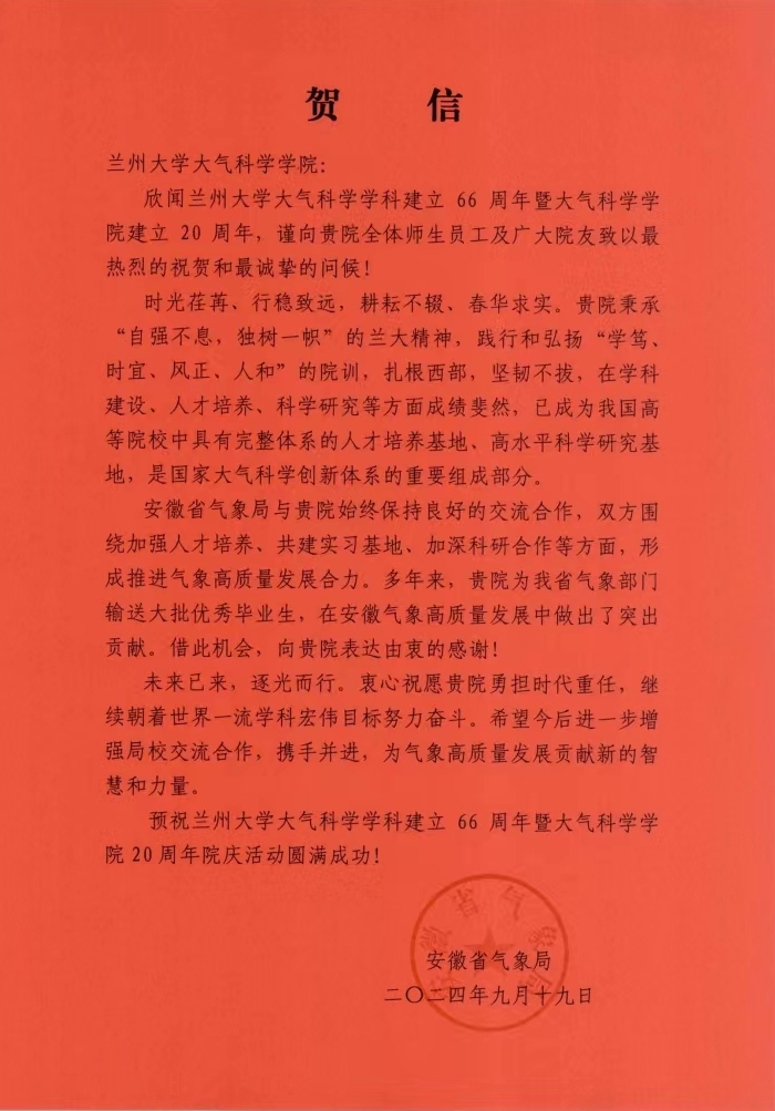 安徽省气象局致bat365官网登录在线主页建院20周年贺信