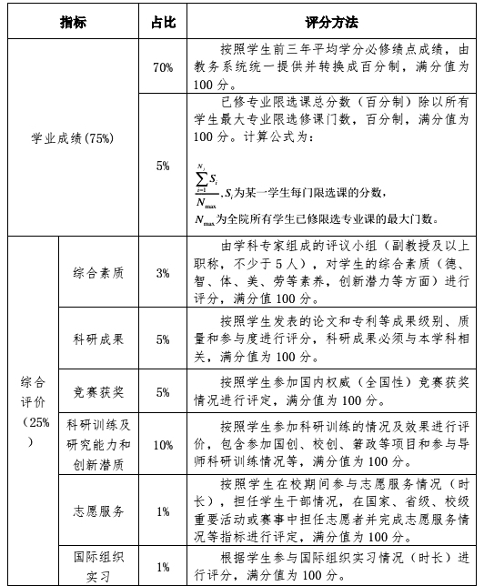 1.学生在科研成果、竞赛获奖、科研训练及研究能力和创新潜质、志愿服务、国际组织实习指标中有多项得分时不累加,只取最高项。