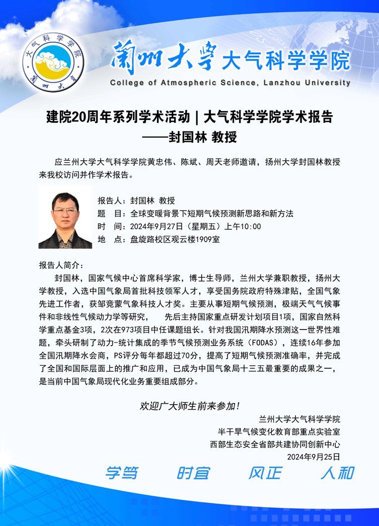 【9月27日】建院20周年系列学术活动|bat365官网登录在线主页学术报告——封国林 教授