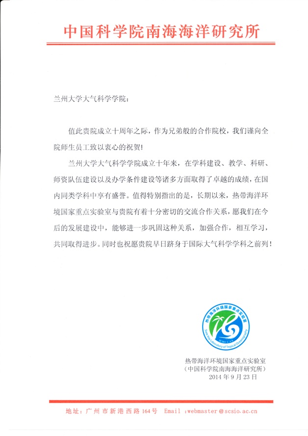 热带海洋环境国家重点实验室(中国科学院南海海洋研究所)贺信