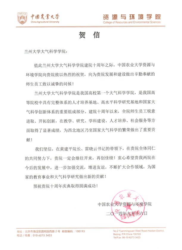 中国农业大学资源与环境学院贺信