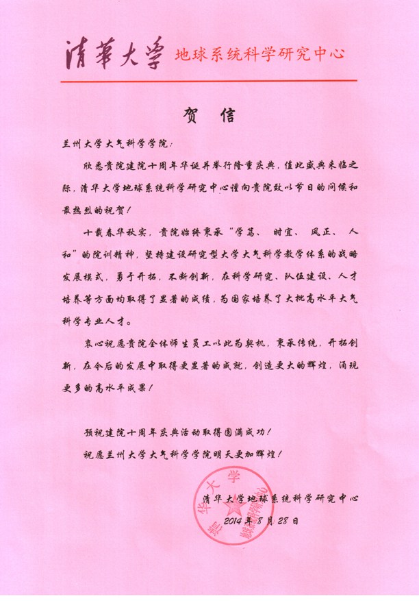 清华大学地球系统科学研究中心贺信