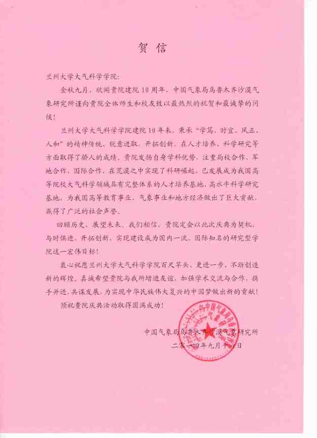 中国气象局乌鲁木齐沙漠气象研究所贺信